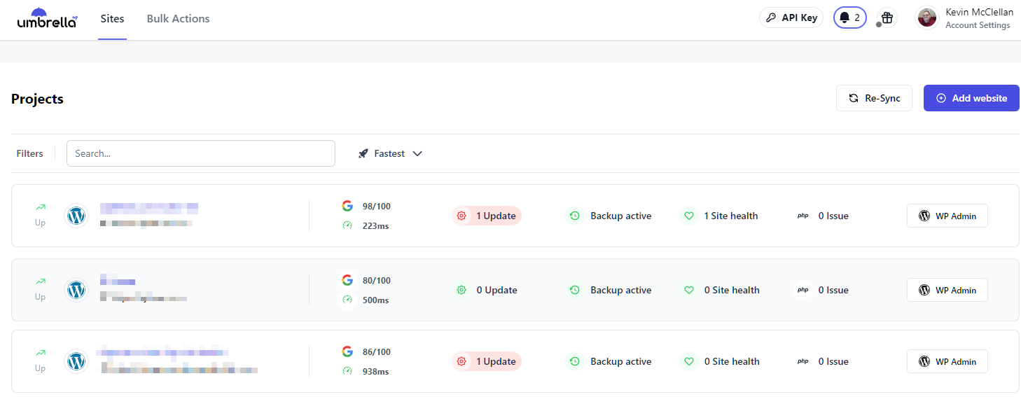 With WP Umbrella, you can connect all your sites to a central dashboard that will allow you to easily manage all your sites. From the dashboard you can quickly see your site speed, available updates, backup status, site health status, php issues, and a link to log you into your admin area for any site that you are managing through WP Umbrella.