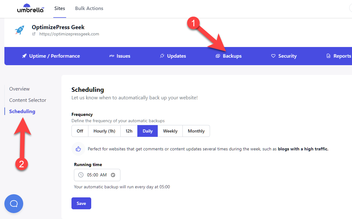 Backing up sites through WP Umbrella is quite simple. All you have to do is login to their dashboard and setup a backup schedule without having to do any other tedious tasks to get the job done, or messing with tons of settings like most backup plugins do. It's just so simple.