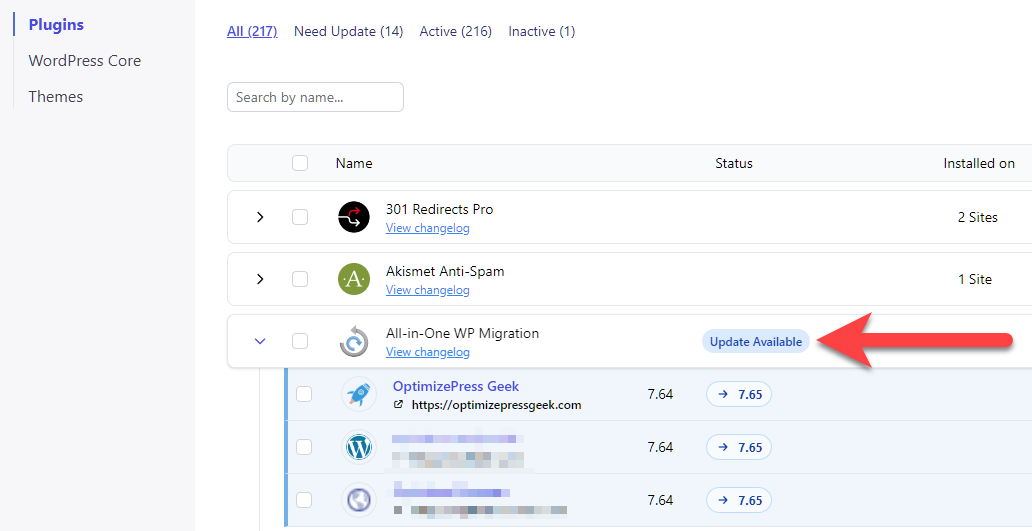 You can view each site to see what updates there are, or you can go to the bulk screen to see what updates are available. If you open the toggle for an item you can see what sites have the update available.